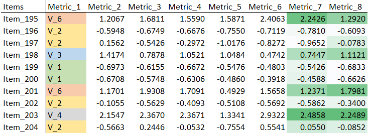 Below is the masked dataset. Row items and column headers have been replaced by generic labels. Individual cell values have been adjusted, to preserve the original pattern while obscuring sensitive data.